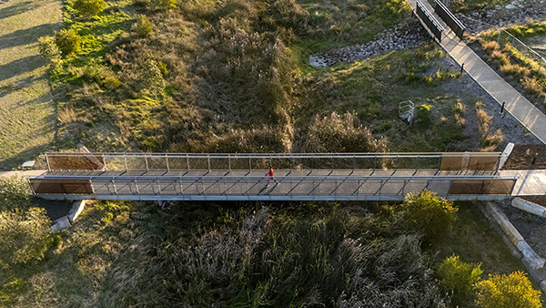 George’s Cove is a major residential community being delivered by Mirvac at Moorebank in Sydney’s south-west. Before granting approval for a new release of dwellings, Liverpool City Council required Mirvac to install a flood evacuation route connecting George’s Cove to nearby Paine Park on the other side of bustling Brickmakers Drive. Mirvac had already received a proposal from another civil contractor, however their bridge design (100% concrete) was deemed to be excessive, both in terms of size and cost.