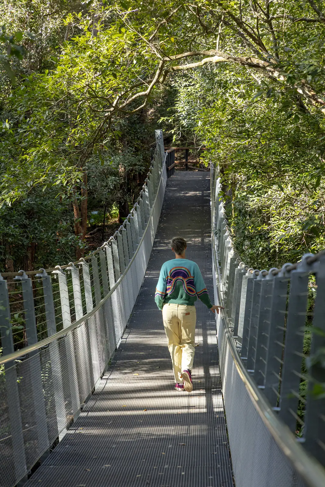 Featuring 30mm galvanised steel support cables, 32 cross beams and FRP mini-mesh decking, the bridge was hand-assembled high above Pyes Creek before opening to the public in mid-2023.