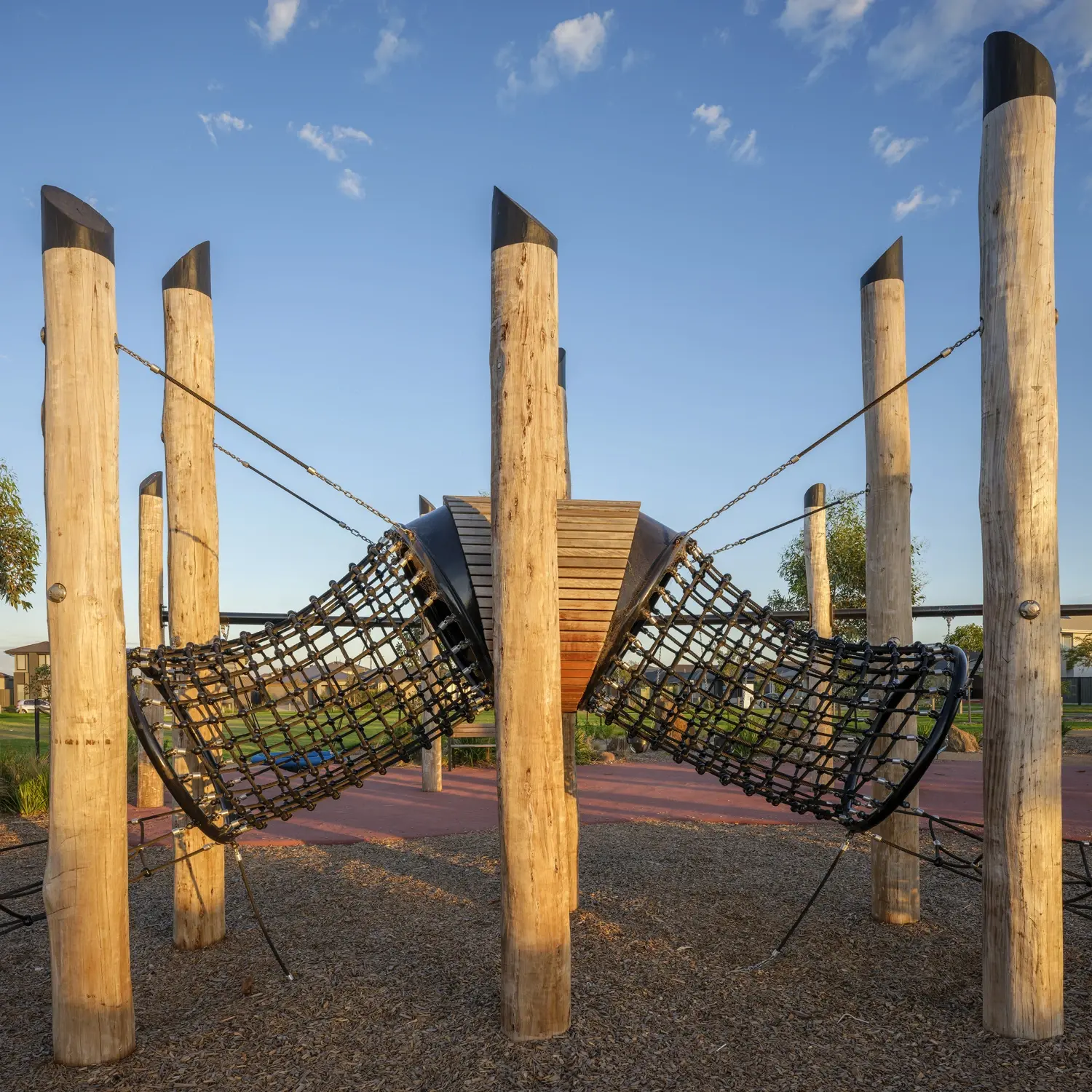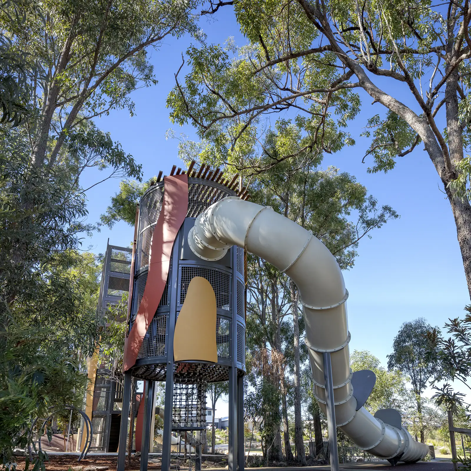 FORGE was engaged to work closely with ASPECT Studios to refine and deliver their original play concept, including a 6-metre timber swing bridge and a striking 7.5-metre-high custom play tower inspired by the red-tailed black cockatoo and the surrounding Casuarina pine trees