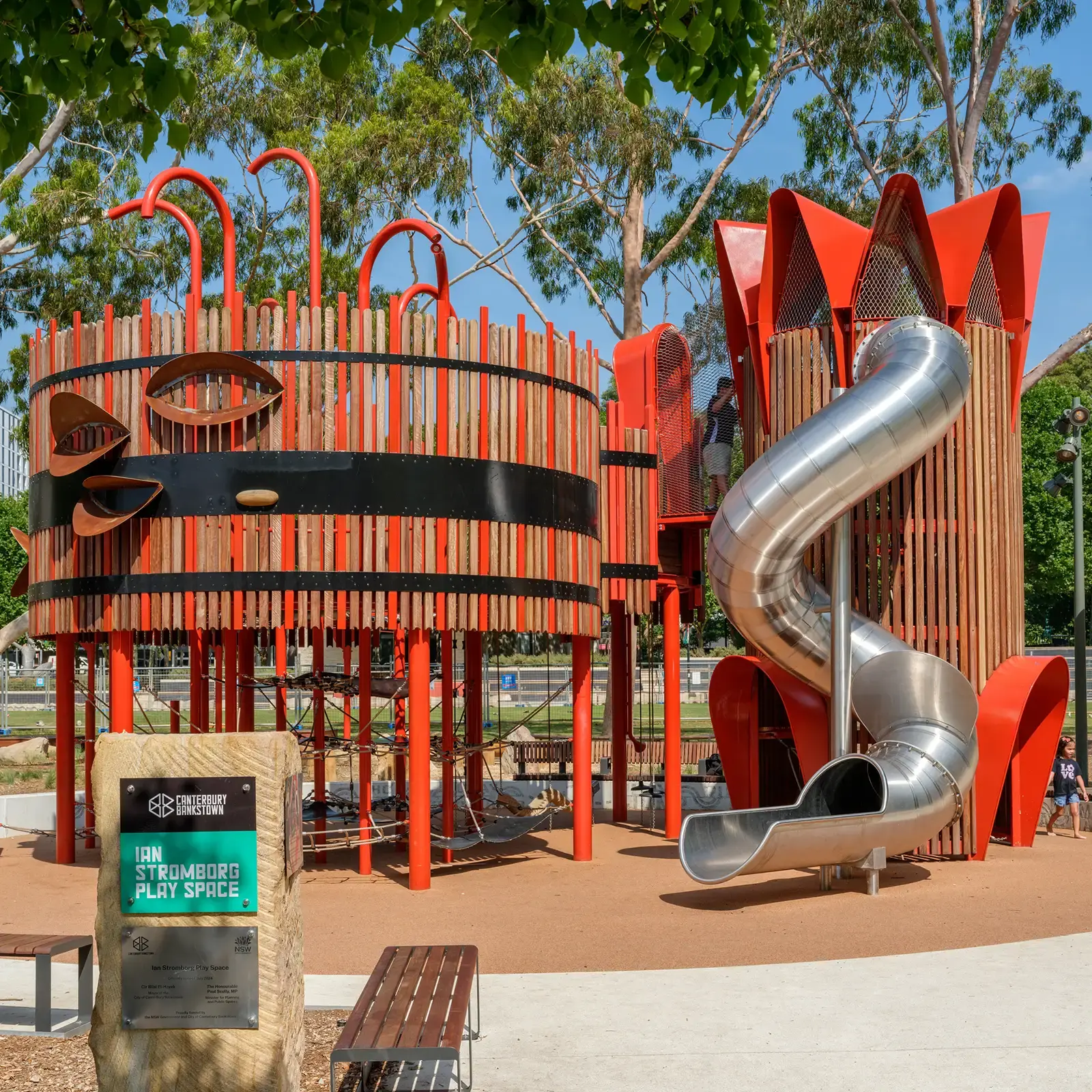 Briefed under the NSW Government’s ‘Everyone Can Play’ guidelines, this richly inclusive play space features a 12-metre play tower and slide, flying fox, junior play items, custom swings, four shelters, picnic furniture, soft fall zones and extensive landscaping.