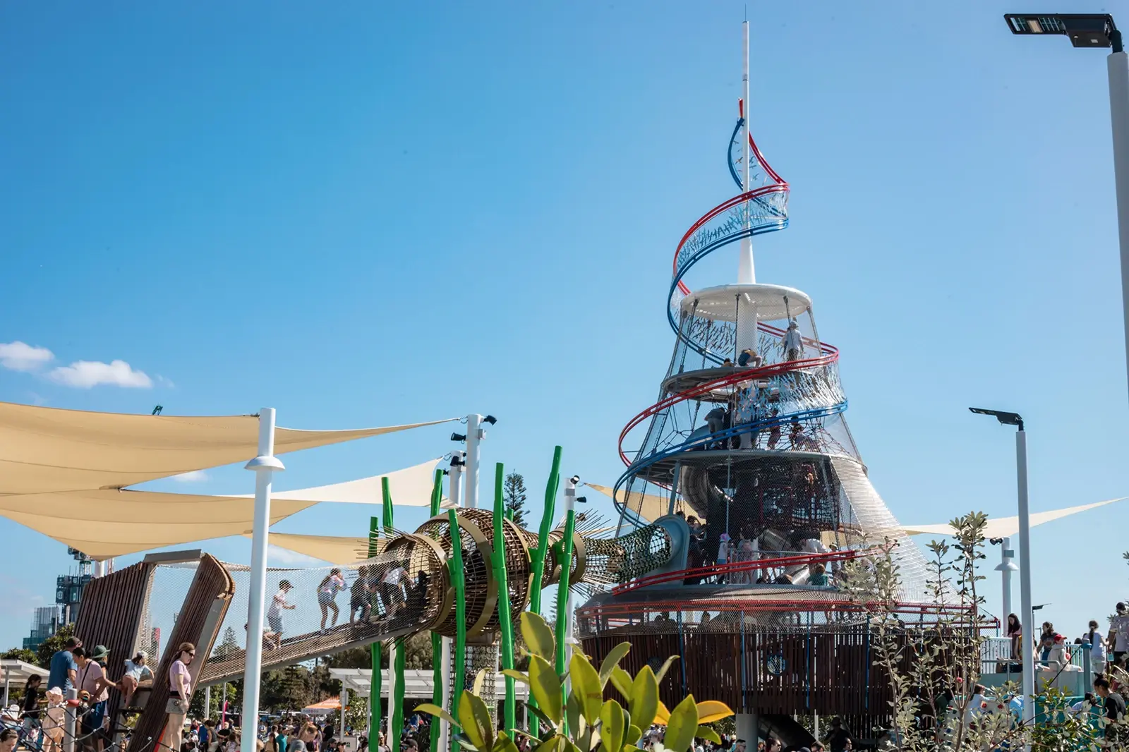 Peninsula Playground, Broadwater ParklandsDelivered for the City of Gold Coast as part of the multi-million-dollar Broadwater Parklands Masterplan, FORGE was engaged with landscape architects AECOM to deliver a ‘destination’ play structure to attract visitors from across South East Queensland and beyond. Inspired by the Gold Coast’s famous coastal lifestyle the vision for the main play tower was to resemble a giant seashell—a wonderfully creative concept that also proved wonderfully complex to achieve.