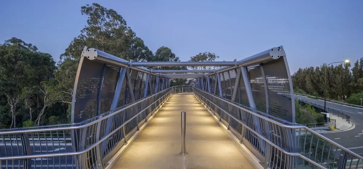 Safety is central to every project decision at FORGE, beginning with the design of pedestrian bridges and cycleways. Considerable thought is given to both structural integrity and user security. From an engineering perspective, bridges must be designed in line with all relevant AS codes and guidelines, ensuring they withstand not only the weight of pedestrian traffic but also environmental factors such as wind loads, seismic activity, flooding events and potential impacts from vehicles passing underneath. User security considerations extend to the provision of adequate lighting, clear sight lines and potentially surveillance systems to ensure that pedestrian bridges and cycleways feel safe and welcoming at all hours. Safe pedestrian bridge design eliminates hiding spots and create a sense of openness that promotes natural surveillance. In some cases, enclosed or partially enclosed designs might be considered to protect users from extreme weather conditions, but these must be balanced against security and ongoing maintenance considerations.