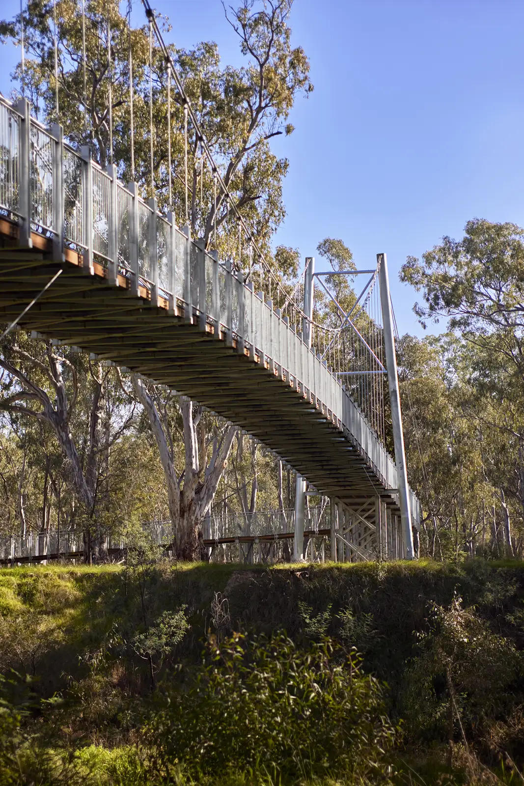 Australian Botanic Gardens Shepparton BridgeGreater Shepparton City Council appointed FORGE as lead contractor to design and deliver a custom 55-metre suspension bridge across the Broken River to connect the popular Botanic Gardens to the Shepparton town centre. Despite numerous challenges—including unstable embankments, repeated flooding and even a magnitude 6.0 earthquake—all structures were successfully delivered as envisioned .