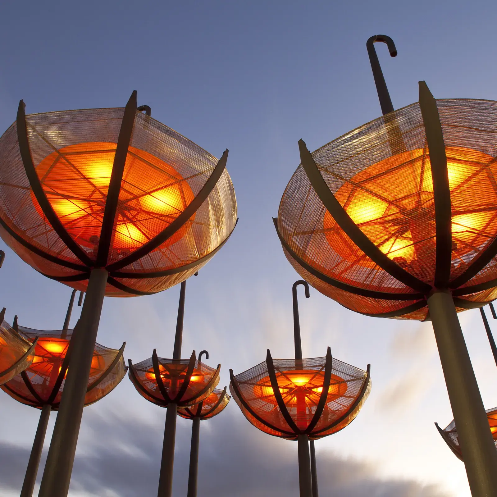 The ‘Float’, Stanhope ParkwayThis award-winning public art installation was delivered by FORGE at The Ponds in north-west Sydney. Developed in close creative collaboration with artists Milne & Stonehouse, a series of elegant engineering solutions were used to bring their initial concept sketches to life. Twelve large, inverted umbrellas are augmented by state-of-the-art lighting—making a bold statement on role of water in Sydney’s ever-changing climate.