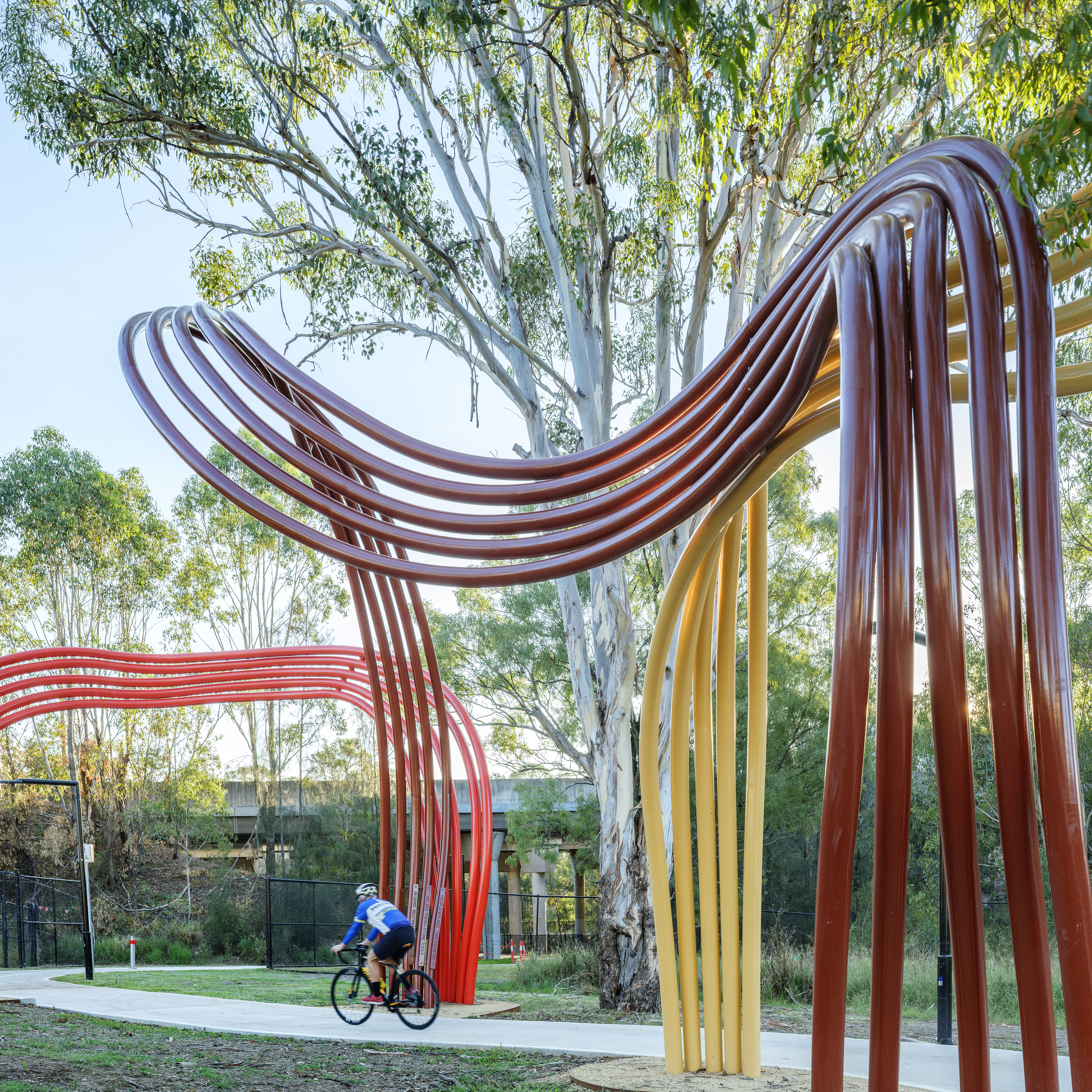 TimeflowsDesigned by Michael Cohen, Studio Chris Fox and Shay Tobin for Blacktown City Council and brought to life by FORGE, ‘Timeflows’ is a stunning public art installation in western Sydney that celebrates Dharug Country and explores the history of land and water through interwoven strands of time. The finished artwork features three giant curved painted steel sculptures, the tallest reaching 7.5-metres high.