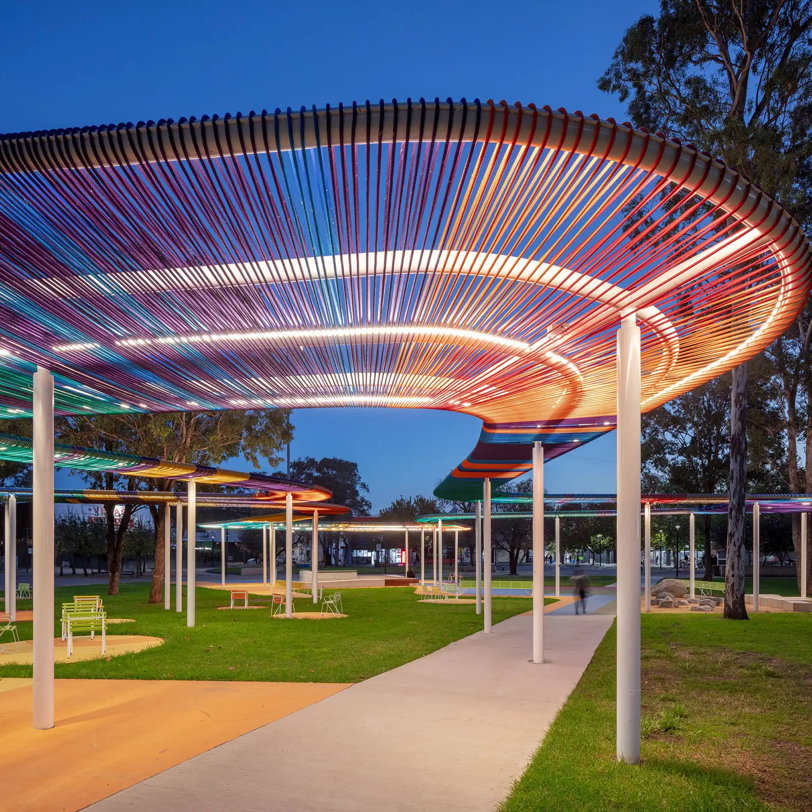 FORGE (formerly Fleetwood Urban) was formally contracted to deliver one of the most visible pillars of the Masterplan – a kaleidoscopic curved custom arbour snaking its way through leafy Dawson Mall. As complex to detail as it was colourful to look at, the creative concept was originally conceived by CHROFI Architects. It featured an interconnected series of giant curved steel tubes, finished with more than 20km of hand-wound steel-cored rope and LED strip lighting and spotlights. -