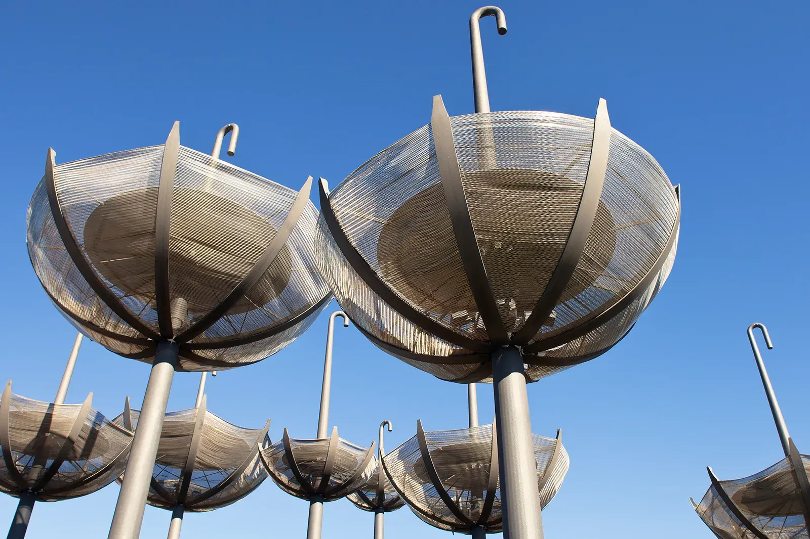 The ‘Float’, Stanhope ParkwayThis award-winning public art installation was delivered by FORGE at The Ponds in north-west Sydney. Developed in close creative collaboration with artists Milne & Stonehouse, a series of elegant engineering solutions were used to bring their initial concept sketches to life. Twelve large inverted umbrellas are augmented by state-of-the-art lighting—making a bold statement on role of water in Sydney’s ever-changing climate.